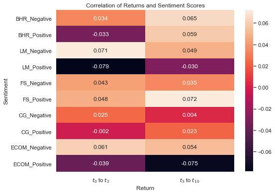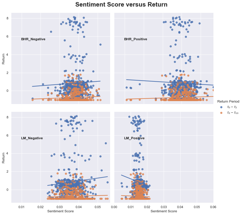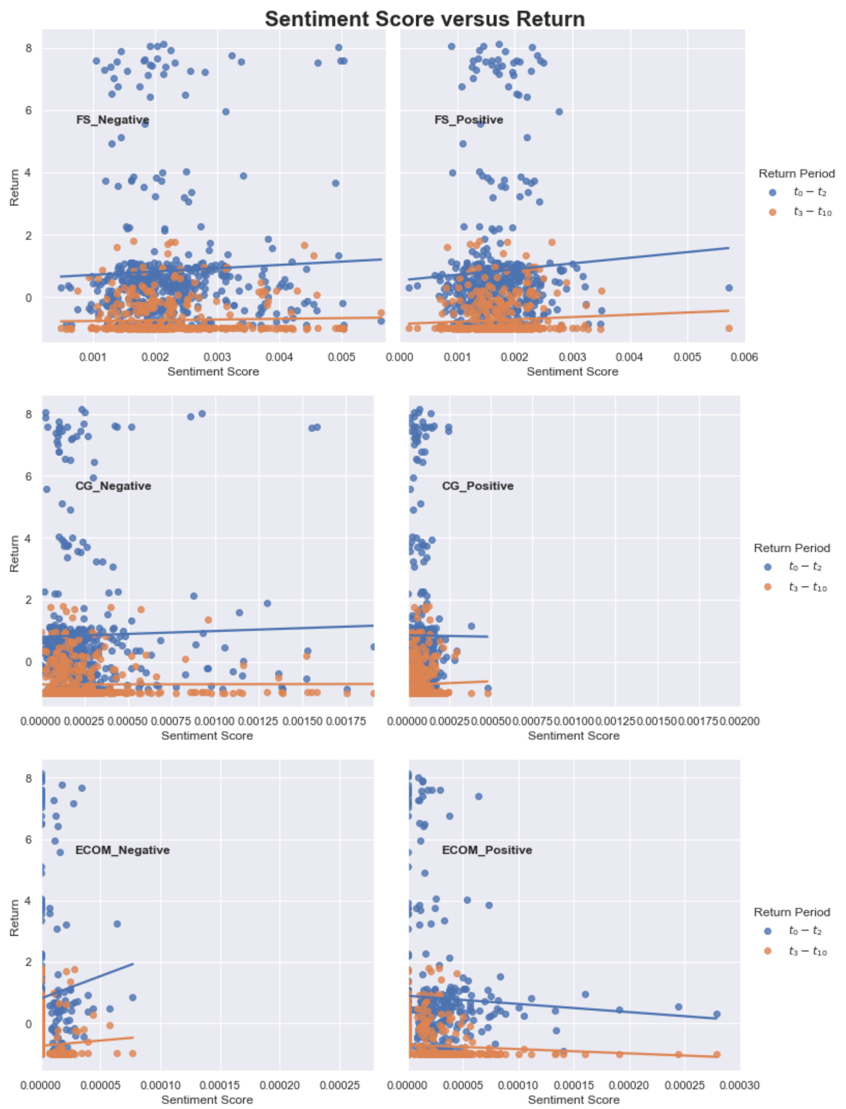 I did this by examining the relationships between sentiments found in 10-K filings and returns following the 10-K's release using two valence-based dictionaries and three topic-based schemes (with financial stability, corporate governance, and e-commerce themes). I found higher absolute correlations for positive sentiments in general, with the largest magnitudes for positive e-commerce topics, positive LM sentiment, negative LM sentiment, and positive financial stability topics.