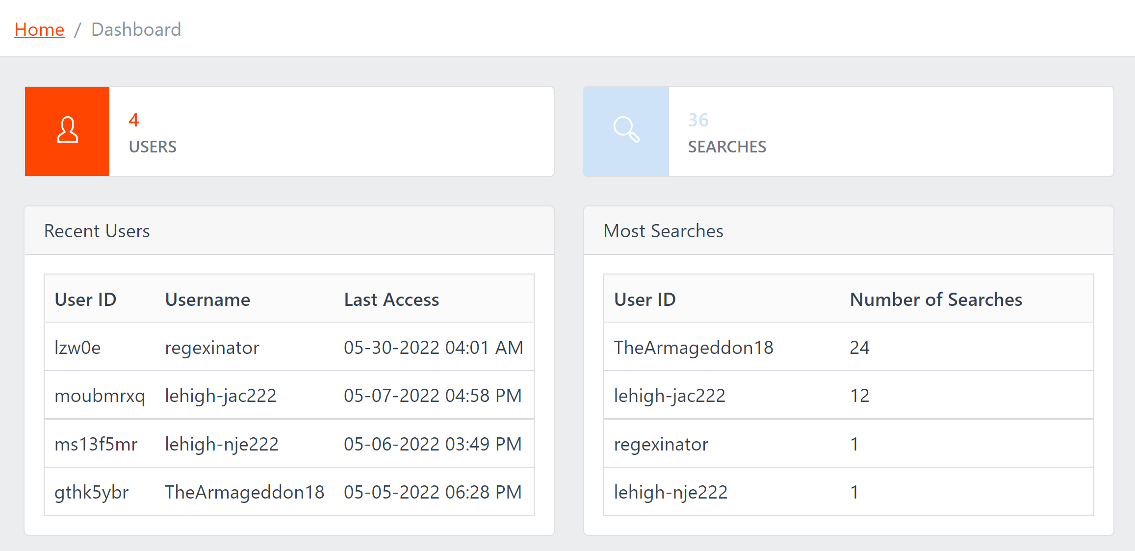 In this demo, you can turn on Administrative mode and act as an authorized user. You then have access to the Dashboard and can explore details like the total number of users, most recent searches, and number of searches per user. In an official release, this toggle would not exist and Dashboard authorization would be based only on privilege levels stored in our database (as displayed in our ER diagram).