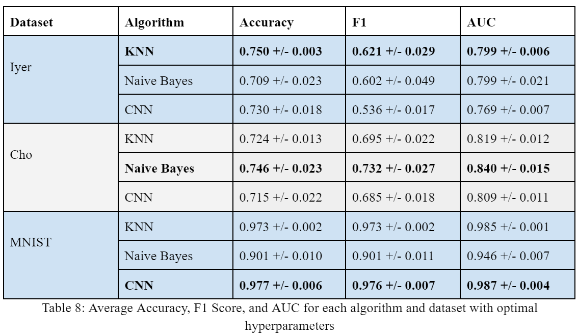 Using the optimal hyperparameters for each algorithm, we found that Naive Bayes performed best on the Cho dataset with an accuracy of 0.746 +/- 0.023, F1 score of 0.732 +/- 0.027, and AUC of 0.840 +/- 0.015. KNN performed best on the Iyer dataset with an accuracy of 0.750 +/- 0.003, an F1 score of 0.621 +/- 0.029, and an AUC of 0.799 +/- 0.006. CNN performed best on the MNIST dataset with an accuracy of 0.977 +/- 0.006, an F1 score of 0.976 +/- 0.007, and an AUC of 0.987 +/- 0.004.