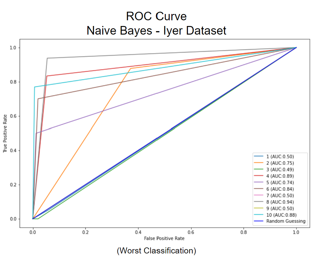 For Naive Bayes, we ran cases with three distinct functions: Gaussian, Multinomial, and Complement. We found the best performance with the Gaussian model for Iyer and Cho datasets and Multinomial for MNIST.